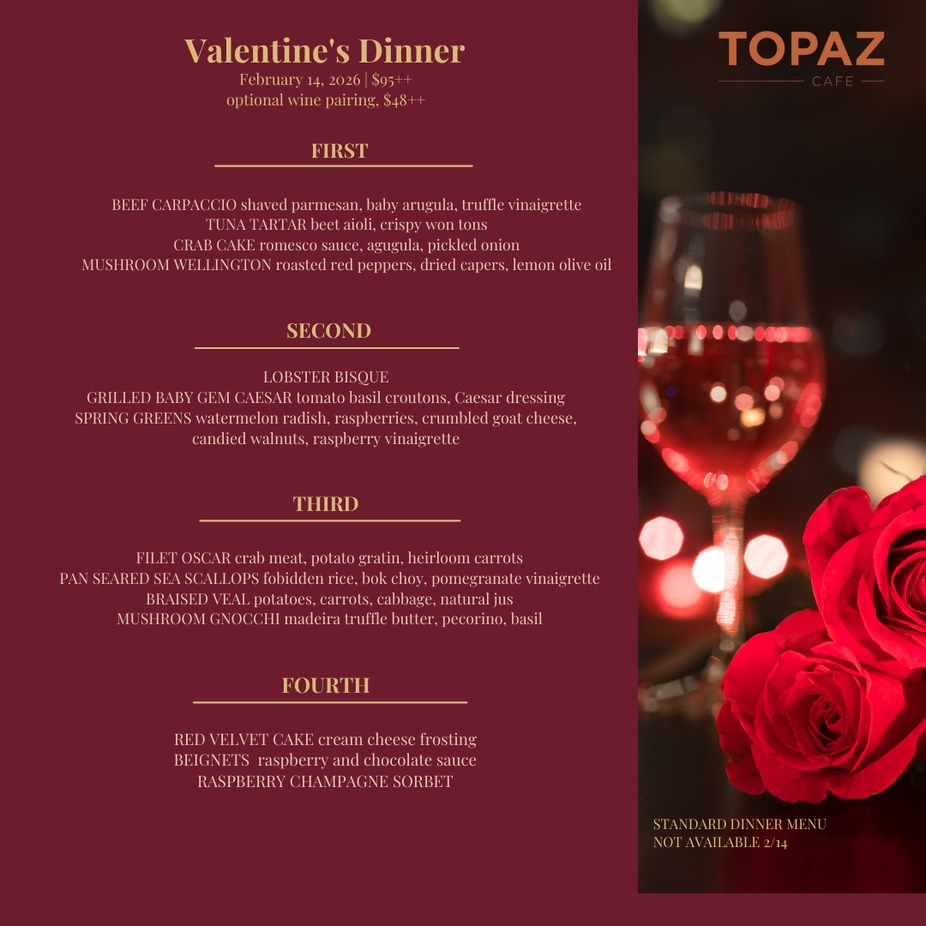 Love is in the air at Topaz! Enjoy our special four course menu to celebrate the holiday. Optional wine pairing available day of. Our standard dinner menu will be unavailable on 2/14. Reservations required, space is limited. A cancellation policy is in effect for this special event.