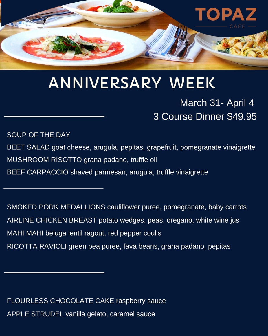 Celebrate our Birthday! Enjoy a special 3-Course Menu during Dinner Hours March 31 through April 4 (standard dinner menu also available).